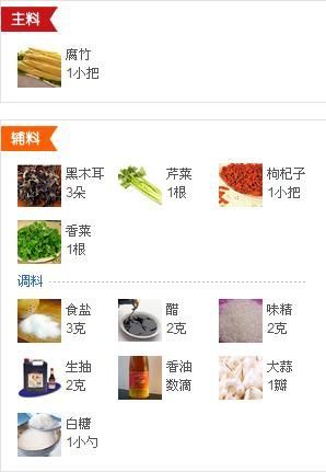 准备好主要食材;将干腐竹、木耳放入水中泡发;待完全泡发好后取出沥干。