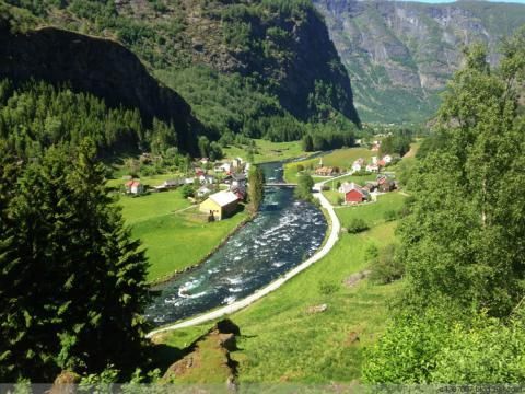 火车离开艾于兰峡湾兰色的支峡和温和、肥沃的海岸气候,在上爬3公里之后,豪瑞纳Hareina在车站前后你可以看到那座1667年建成的小巧、棕色、木结构的弗洛姆教堂,亭亭玉立于美景之中。在教堂旁边的农场,你可以看到为纪念诗人皮尔. 斯维勒Per Sivle而树立的高大纪念石碑,这里是他的出生地。背景是直冲蓝天的壮丽的维德麦斯鼻山Vidmesnosi,尤安达瀑布Rjoandefossen自山涧直泻140米,象一条庆贺的彩带,使人流连忘返。