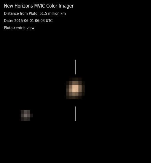 這些照片是“新視野號”探測器距離冥王星表面5000萬公里處拍攝的。呈現出了冥王星和冥衛一的真實顏色。其中,冥王星為橙黃色,而冥衛一則為灰色。