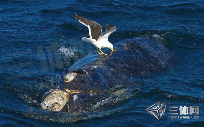 海鷗落在鯨魚皮膚上時,開始用嘴挖掉鯨魚的背部皮膚,圖中顯示的是一隻南露脊鯨,背上的皮膚和脂肪是海鷗的最愛。