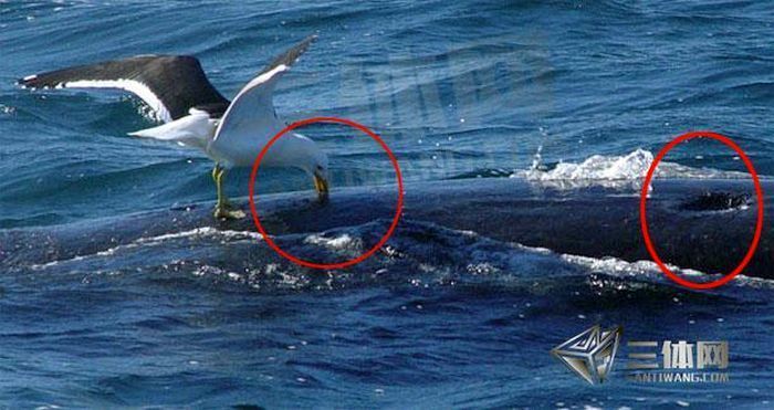 許多海濱小鎮都認為海鷗不是一個善類,研究發現海鷗攻擊在水面呼吸的鯨魚,越來越多的大型海洋哺乳動物背上巨大的傷口來自海鷗的襲擊。圖中這隻南露脊鯨就遭遇海鷗襲擊,研究人員擔心這可能會導致大型海洋哺乳動物非正常死亡。事實上海鷗學會攻擊鯨魚不是自古以來就有的,這個現像在1970年代被發現,這是海鷗第一次學會了在南露脊鯨背上獲得所需要的物質,近年來這個現場變得更加嚴重,似乎它們都學會了。
