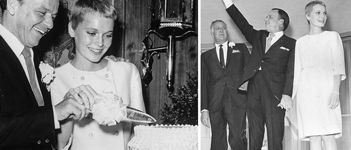 (第十二套)一个具指标性而非传统的婚纱礼服,是米娅•法罗(美国女演员,演出超过四十部影片并获得金球奖、英国电影和电视艺术学院最佳女演员等奖项。同时她也身兼联合国儿童基金会亲善大使的身份)的时尚西装套裙,她在1966年穿着这件礼服当嫁给法兰克•辛纳屈(著名美国男歌手和奥斯卡奖得奖演员。常被公认为20世纪最优秀的美国流行男歌手)。当时候他50岁,而她21岁。
