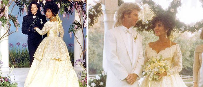 (第十套)1991年,伊丽莎白•泰勒梦幻庄园(迈克尔•杰克逊的故居),嫁给一名建筑工人。这是她第八次,也是最后一次的婚礼,与她的好朋友迈克尔•杰克逊一起出席。这一次,她选择了一件黄色的礼服。