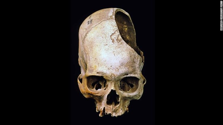 有個男人的整個左上方的頭骨被石頭刀削掉。這種手術是2,400年前在美國最早舉行的手術。