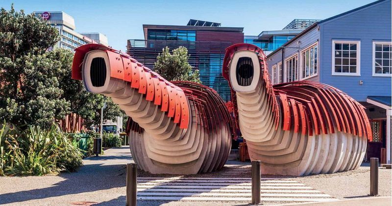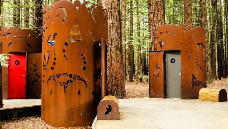 新西蘭,羅托魯瓦(Rotorua),紅樹林廁所(Red Woods Toilets): 這些公廁裝在毛利藝術家Kereama Taepa所設計的罩子裡。外面刻繪的是已經滅絕的或瀕臨滅絕的本土鳥類。