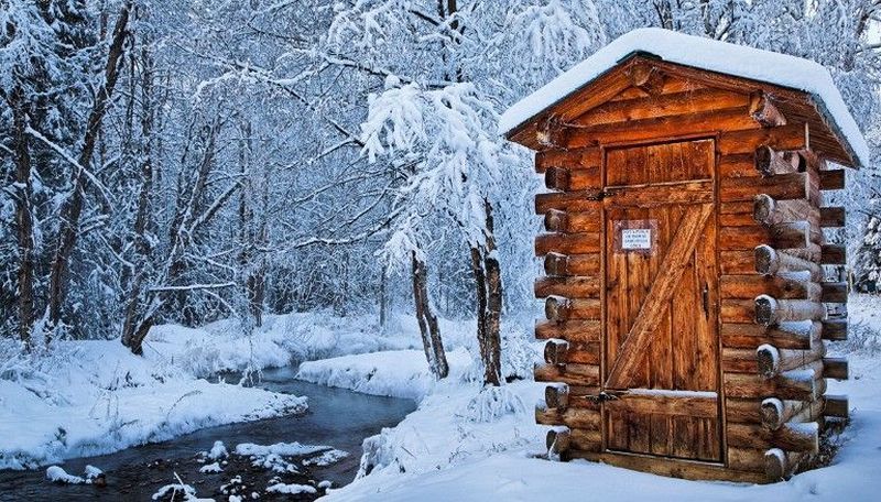 阿拉斯加,切納溫泉度假村(Chena Hot Springs Resort),小木屋: 僅限員工使用的木製洗手間,有助於減少在切納溫泉度假村出現的黃色的雪。