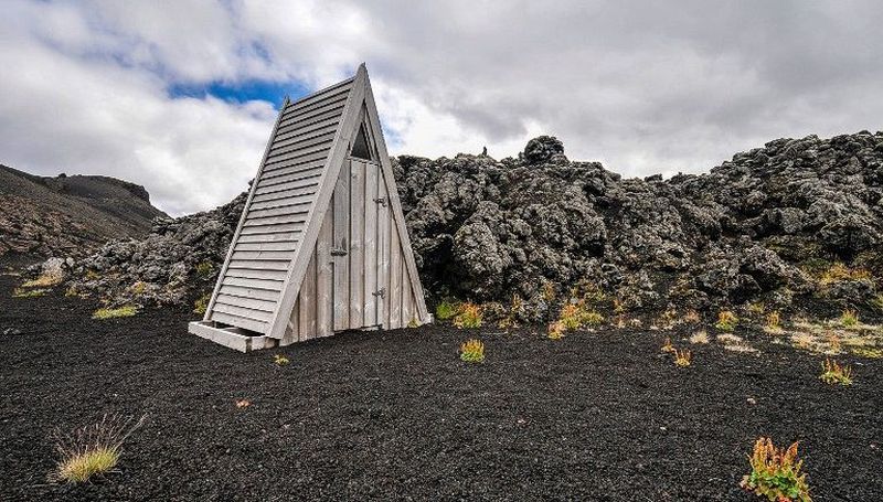 冰島,菲加拉巴克自然保護區(Fjallabak Nature Reserve): 不要看那些石化的熔岩,在這條Laugahraun健行步道上,真正吸引人的是這個三角形的廁所。