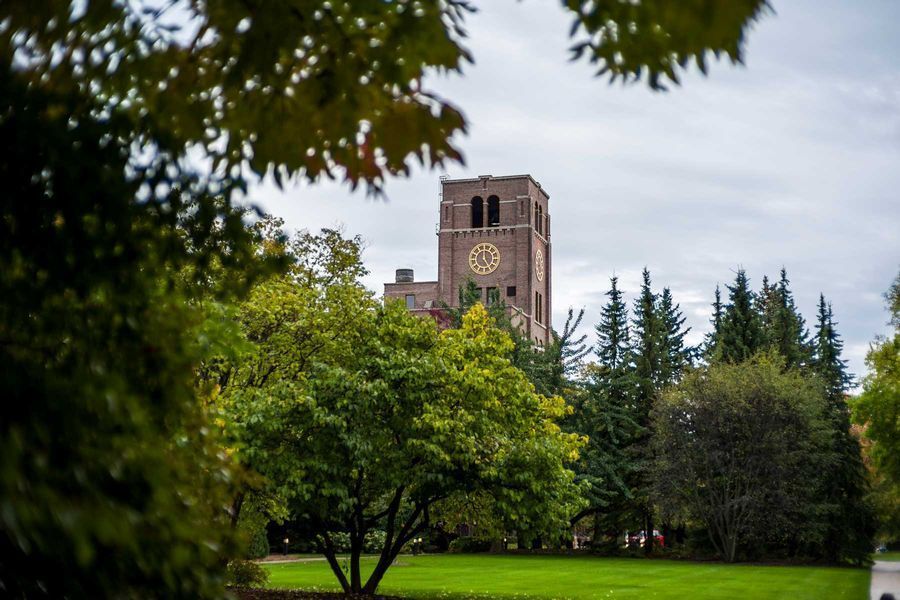 A tower clocks architecture rising above the trees in Kohler, Wisconsin.