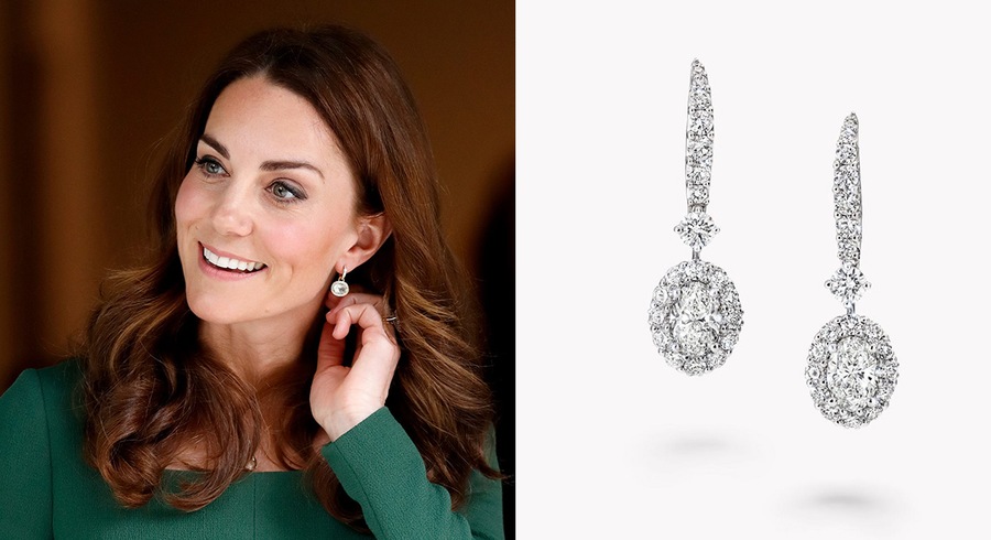 △ 2019年,凱特王妃於出席倫敦某活動時,選擇了一款精緻的鑽石水滴耳環來搭配她那件深寶石綠色禮服。這款橢圓形水滴耳環外觀小巧,卻光彩奪目。密鑲的鑽石璀璨奪目,使其成為絕佳之選。