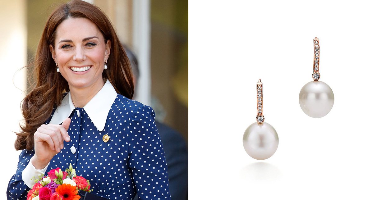 △ 當凱特王妃(劍橋公爵夫人)造訪英國布萊切利莊園(Bletchley)時,身穿經典波點連身裙,穿著精美絕倫的珍珠耳墜。圓形明亮式切割鑽石鑲嵌於玫瑰金底座,垂墜於圓潤飽滿的南海珍珠之上,所有元素完美融合,成就了一套足以世代相傳的珠寶臻品。