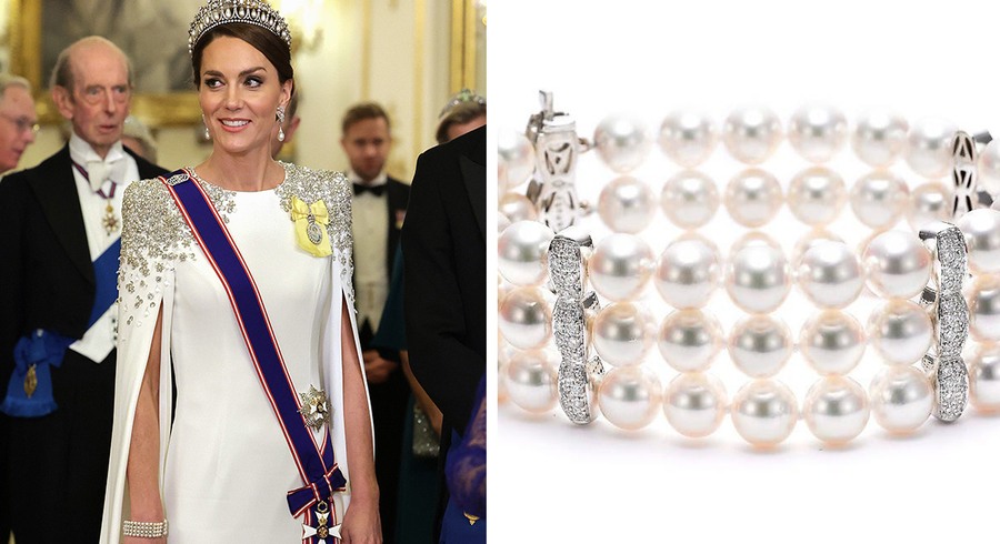 △ 在白金漢宮舉行的一場國宴上,凱特王妃身著名家設計的精美披肩禮服,搭配珍珠鑽石冠冕,以及一條層疊珍珠手鍊,上面鑲嵌96顆鑽石,完美展現了珍珠的貴美。