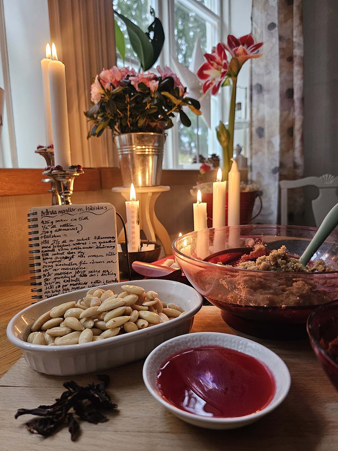 12月,家人经常一起在家制作糖果,并且一次会准备多种不同的糖果,而不是只做一种甜点。糖果、饼干和糕点会与客人分享,作为礼物赠送,并在整个节日期间享用。常见的糖果包括硬太妃糖(knäck)、软巧克力(ischoklad)、薄荷糖(polkagris)。常见的烘焙点心有薄姜饼干(pepparkakor)和藏红花面包(lussekatter)。 (图片©️中土杂志|Pernilla Gäverth)