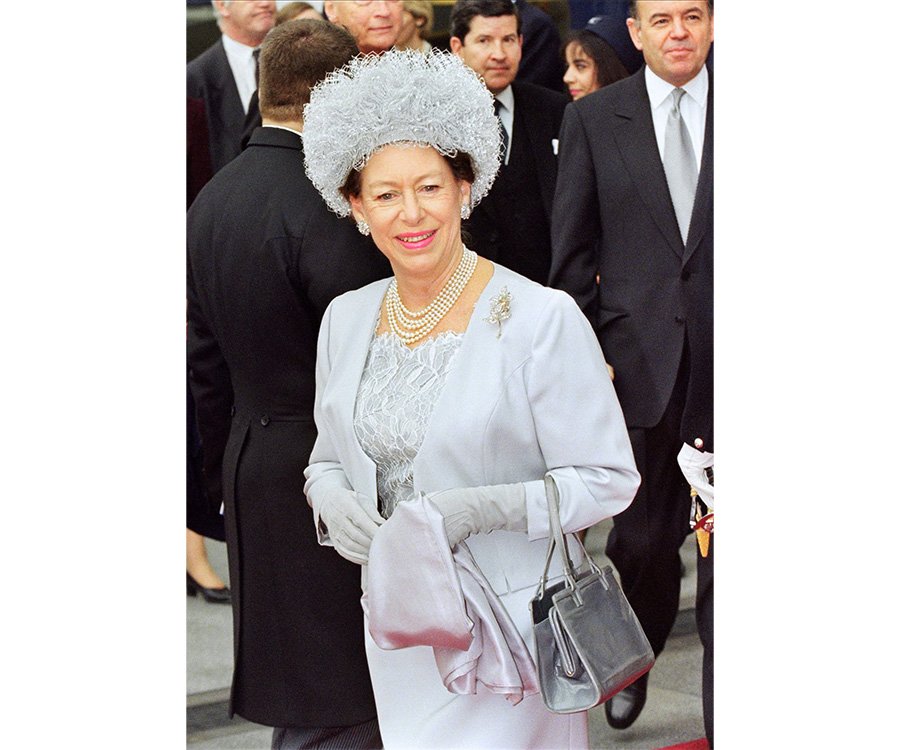 △ 1993年10月8日,瑪格麗特公主身著紅色和黑色禮服出席了兒子大衛(David Linley)的婚禮。