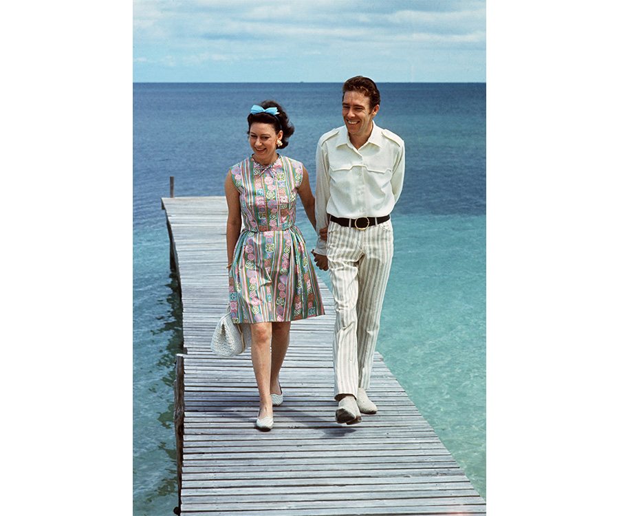 △ 1967年,瑪格麗特公主身著印花連衣裙,頭戴藍色蝴蝶結發飾,與丈夫斯諾登伯爵在巴哈馬群島(Bahamas)走過浮橋。