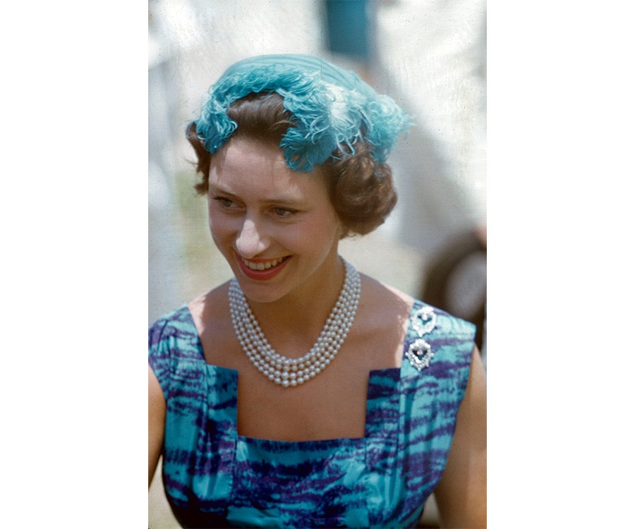 △ 1956年,瑪格麗特公主在訪問東非期間,頭戴飾有羽毛的藍色帽子,佩戴珍珠項鍊,身穿印花連衣裙。