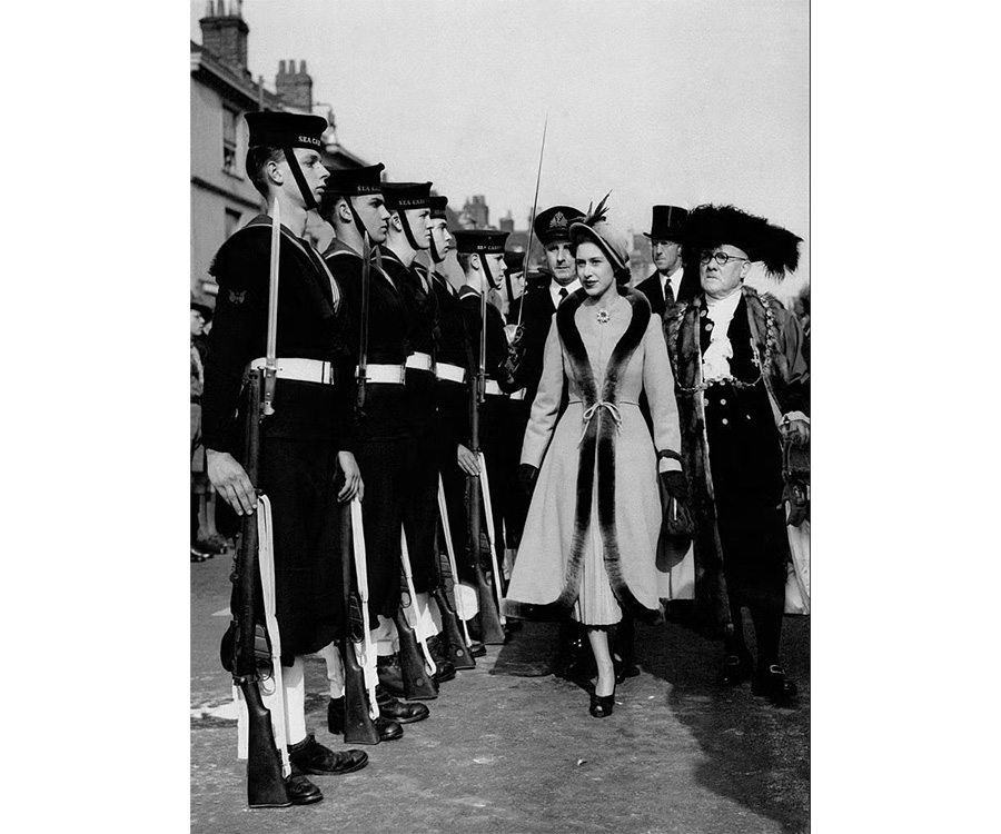 △ 1949年3月28日,瑪格麗特公主與布里斯托爾市長,在布里斯托爾接受儀仗隊迎接。她身穿一件鑲有皮草邊的外套。