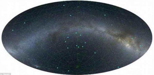 美國和匈牙利科學家組成的小組,發現了由九個伽馬射線暴(Gamma Ray Burst, GRB)組成的環狀結構,直徑達50億光年。伽馬射線暴的分布如上圖藍點所示。