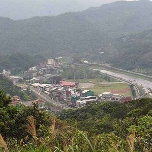從秀崎山登山步道俯瞰柑坪社區,左中下方的廟宇是瑞福宮, 柑坪社區內的紅土草地為瑞芳棒球場。右側是基隆河,遠處是三貂嶺