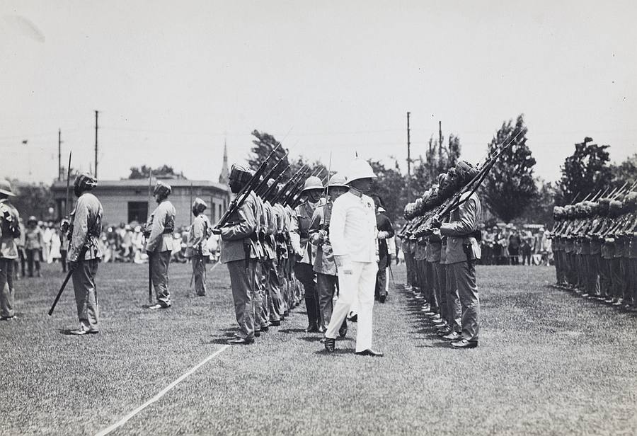 △ 英国驻上海总领事馆前,巴顿爵士(Sir Sidney Barton)正在检阅上海市警察锡克教分队队伍,为参加例行活动中的阅兵预演。他们是上海公共租界的管理机构雇员之一。