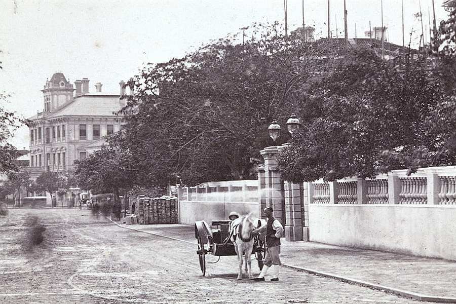 △ 第一次鸦片战争(1840-1842)结束后不久,外资银行便进入中国。第一家在中国开业的外资银行是东方银行(Oriental Bank),这张摄于1870年左右的照片显示,它隐匿在上海外滩的树丛后。起初,外资银行在中国的业务主要由英国的银行主导。然而,从1890年代开始,外资银行的业务变得更加多元化,许多其他国家的银行也纷纷进入中国市场。除了1890年在上海开始营业的德亚银行(DAB; Deutsch-Asiatische Bank)外,另一个在1890年后进入中国的非英国银行的例子是日本臺湾银行(Japanese Bank of Taiwan)。