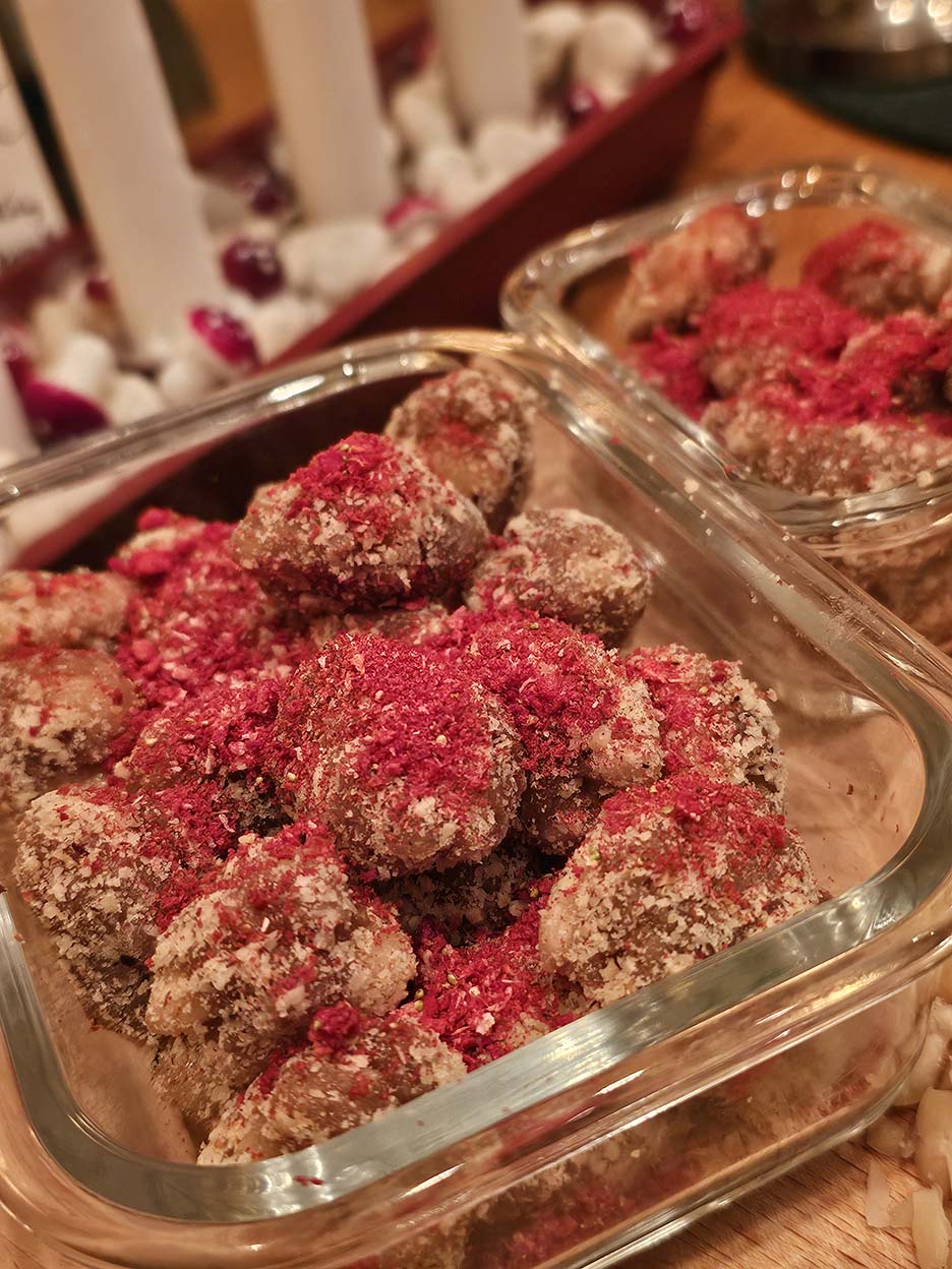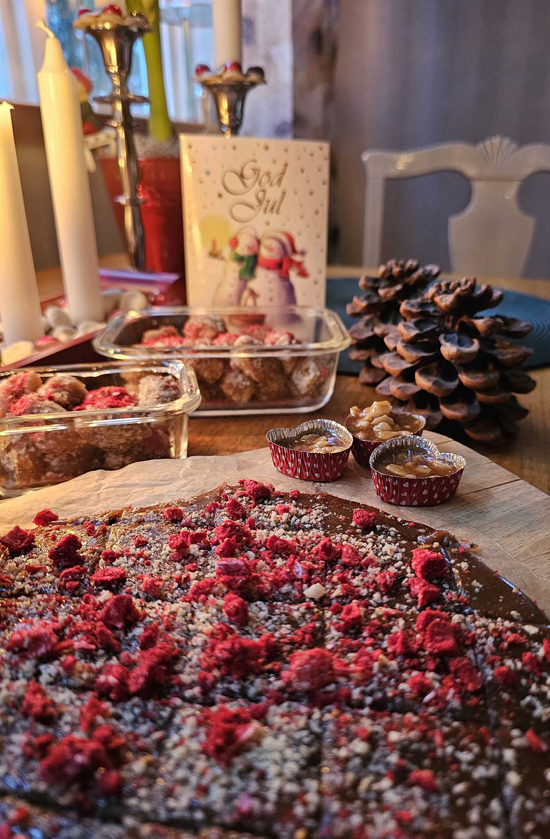 从12月开始,瑞典的家庭就经常一起全家制作圣诞糖果,并且一次会准备多种不同的糖果,而不是只做一种甜点。糖果、饼干和糕点会与客人分享,作为礼物赠送,并在整个节日期间享用。常见的糖果包括硬太妃糖(knäck)、软巧克力(ischoklad)、薄荷糖(polkagris)。常见的烘焙点心有薄姜饼干(pepparkakor)和藏红花面包(lussekatter)。 (图片©️中土杂志|Pernilla Gäverth)