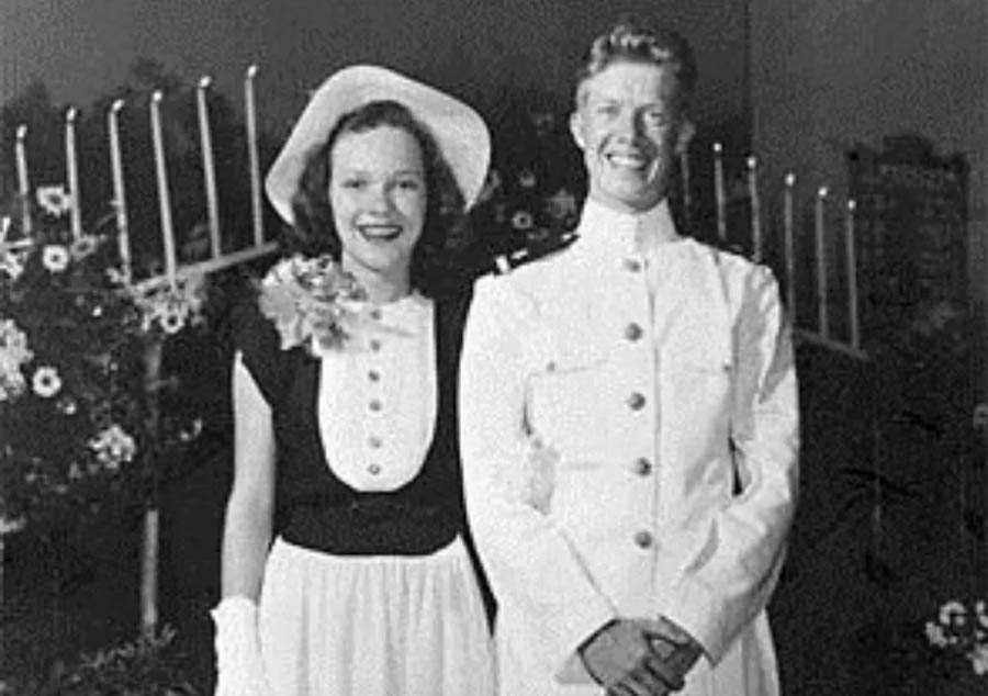 △ 吉米卡特(Jimmy Carter)和罗莎琳(Rosalynn Smith)于1946 年就结婚了。当时他21 岁,罗莎琳18 岁。她最初拒绝了吉米的求婚,等到在他从美国海军学院(US Naval Academy)毕业后才接受了。卡特后来担任美国第39任总统(1977–1981)。