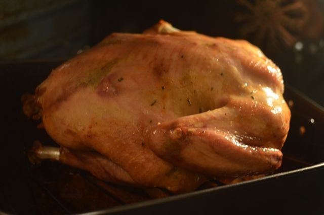 看火雞的大小,我的是13 磅,225度烤將近14個小時,你放進去幾乎就不用管了,最後45分鍾錫箔紙拿開,讓它brown.