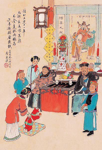 燃放完爆竹後,人們回到屋中的第一件事就是拜天地、迎神、祭祀祖先。大人們還要給小孩子壓歲錢。之後,大家繼續圍坐在一起,聊天、遊戲,通宵達旦,謂之「守歲」。