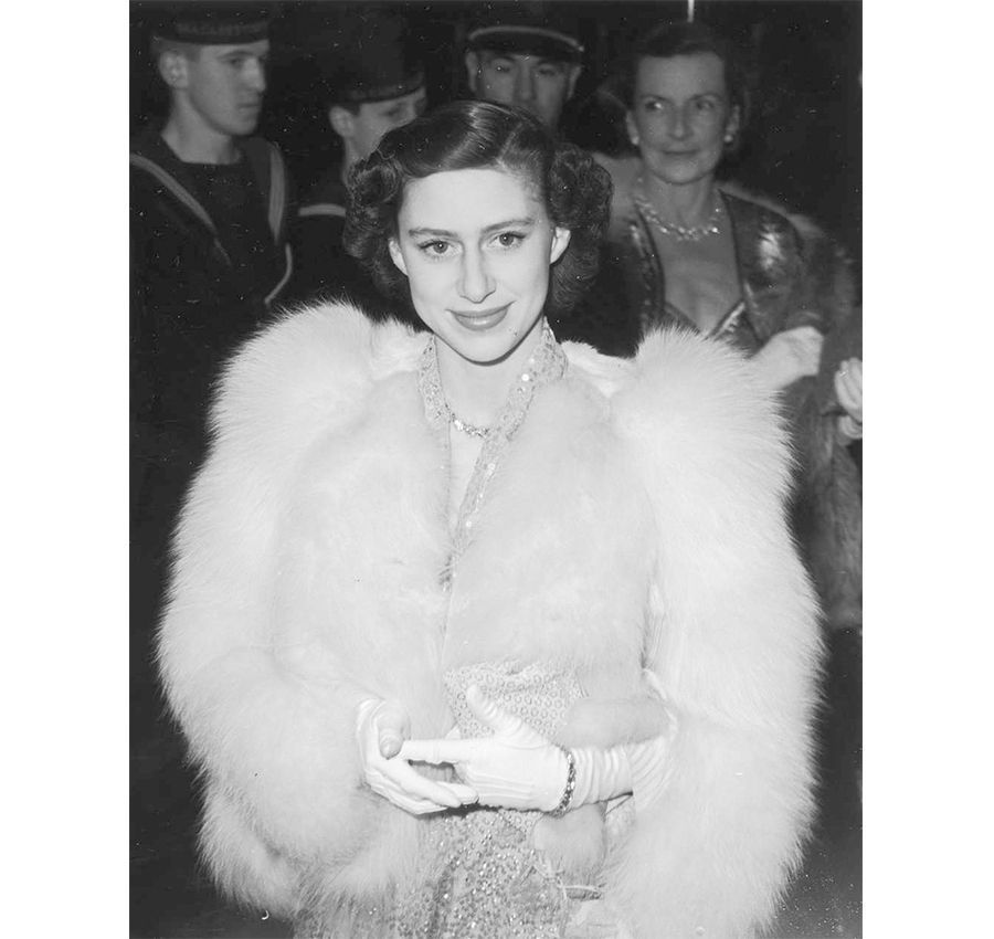 1944年,瑪格麗特公主為了畫肖像,穿著正式的晚禮服,手捧著粉紅色的玫瑰。