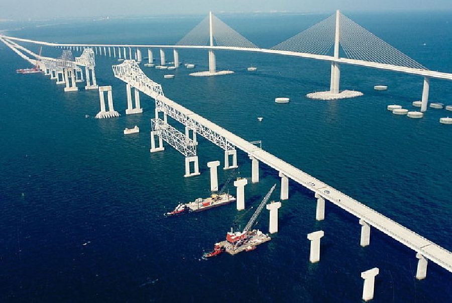 美國,佛羅里達州,陽光高架橋(The Sunshine Skyway Bridge, Florida):佛羅里達半島三面環水,肯定會有一些橋樑,例如「陽光天橋」(Sunshine Skyway Bridge)。最初在1954年,該橋樑經歷了兩次悲劇性事故,其中一次還導致南行的橋樑局部坍塌。目前的大橋於1987年開放,舊橋的坍塌殘餘物現在被用作釣魚碼頭。