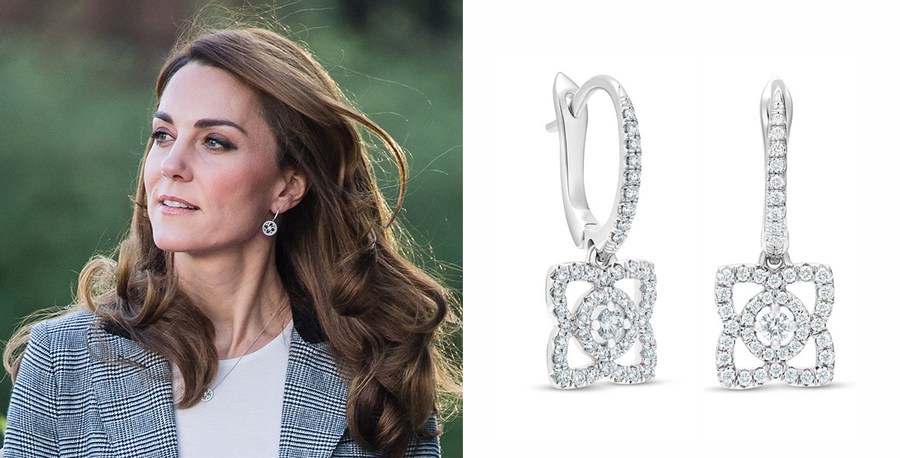 △ 凱特王妃穿著剪裁合身的西裝外套,搭配同樣精緻的鑽石耳墜,整體造型十分優雅。耳墜的圓形設計與外套的線條形成柔和的對比。這款耳墜的優美造型源自蓮花,也是許多文化中的神聖象徵。