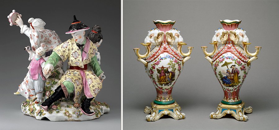△ 左圖︰歌舞者,軟瓷,1755年製作。右圖︰有中國風場景的大象花瓶,約1760年製作,是有巴黎郊區著名的塞夫勒工廠 Sèvres manufactory生產的。