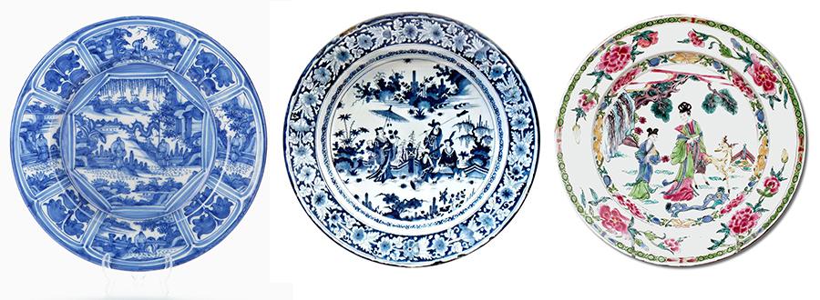△ 上左圖為中國風瓷器,法蘭克福製造,約1700年。上中圖為帶有中國場景的彩陶,約1680年。上右圖為英國製造,軟瓷盤子,約1755年製造。