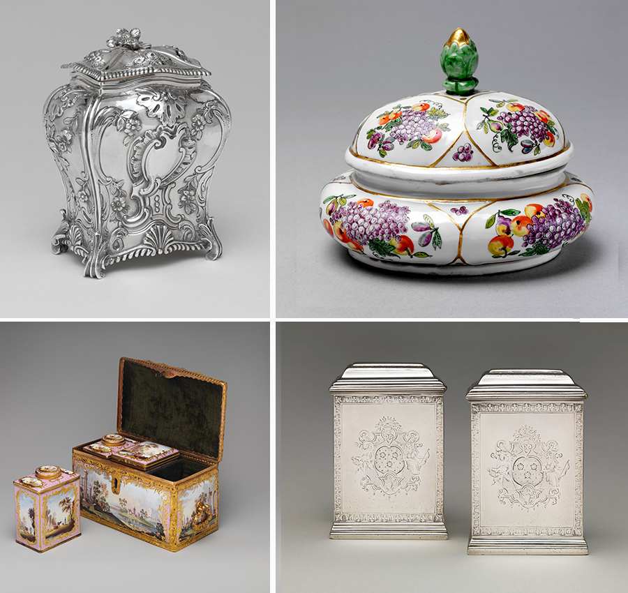 △ 上左圖為1762年,英國,銀器,茶葉罐。上右圖為1730 年,奧地利,硬質瓷盒。下左圖為1770年,英國,銅質葉罐,白色琺瑯。下右圖為1726年,英國,茶葉罐。