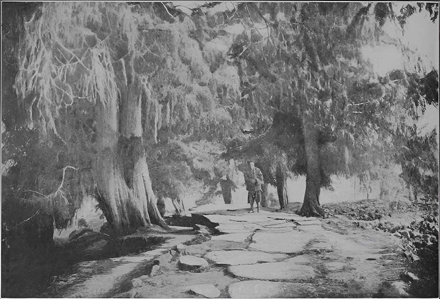 △ 北京到四川成都的石頭古道:這條古道初建於一千多年前,在當時是一項浩大的工程。整條路都鋪著粗糙的石板,大約八英尺寬,也就是路寬的一半左右,路的兩旁種滿了雪松。如今,這條路年久失修,就像中國的許多地方一樣,石板也時常脫落、消失;但它仍然受到官方的重視,每年都有官員前來巡視,清點雪松的數量,有許多樹木已經枯死了,但仍有許多存活下來,成為路邊一道壯麗的風景。