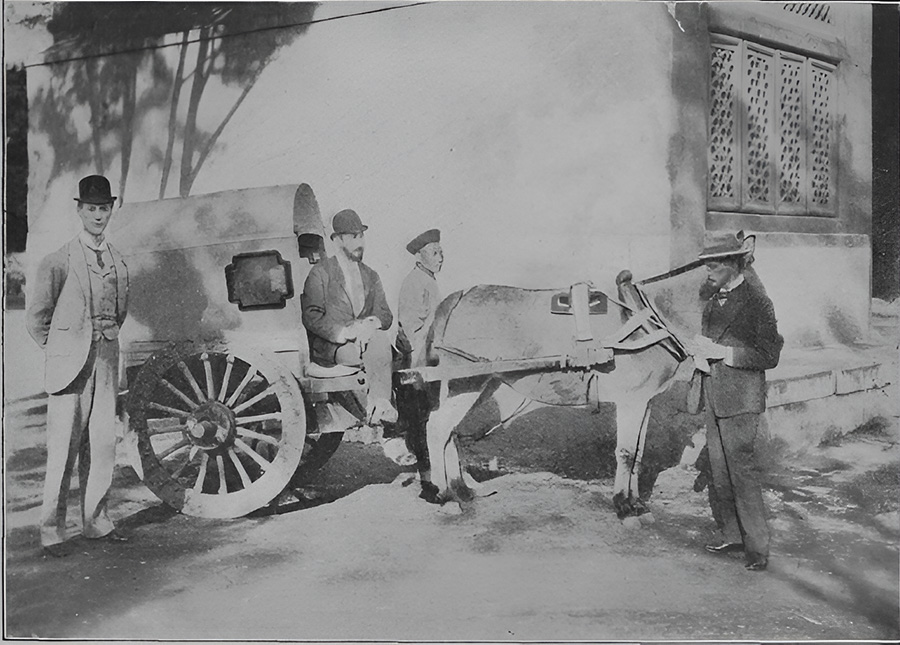 △ 英國公使館的馬車:當時中國幾乎沒有馬車專用道,上圖這輛簡陋的、沒有彈簧座墊的馬車是英國公使館內,唯一的一輛馬車。在圖片左側的是英國女王派駐中國的全權領事甘伯樂(O. W. Campbell),坐在馬車上的是公使館一等秘書寶克樂(W. N. Beauclerk)。