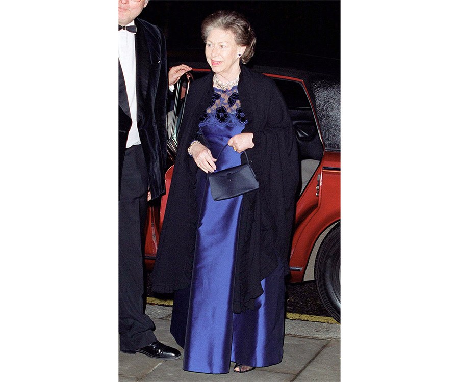 △ 1990年7月19日,瑪格麗特公主身穿藍色披肩禮服,出席在倫敦帕拉丁劇院(the London Palladium)舉行的女王母親90歲生日慶典。