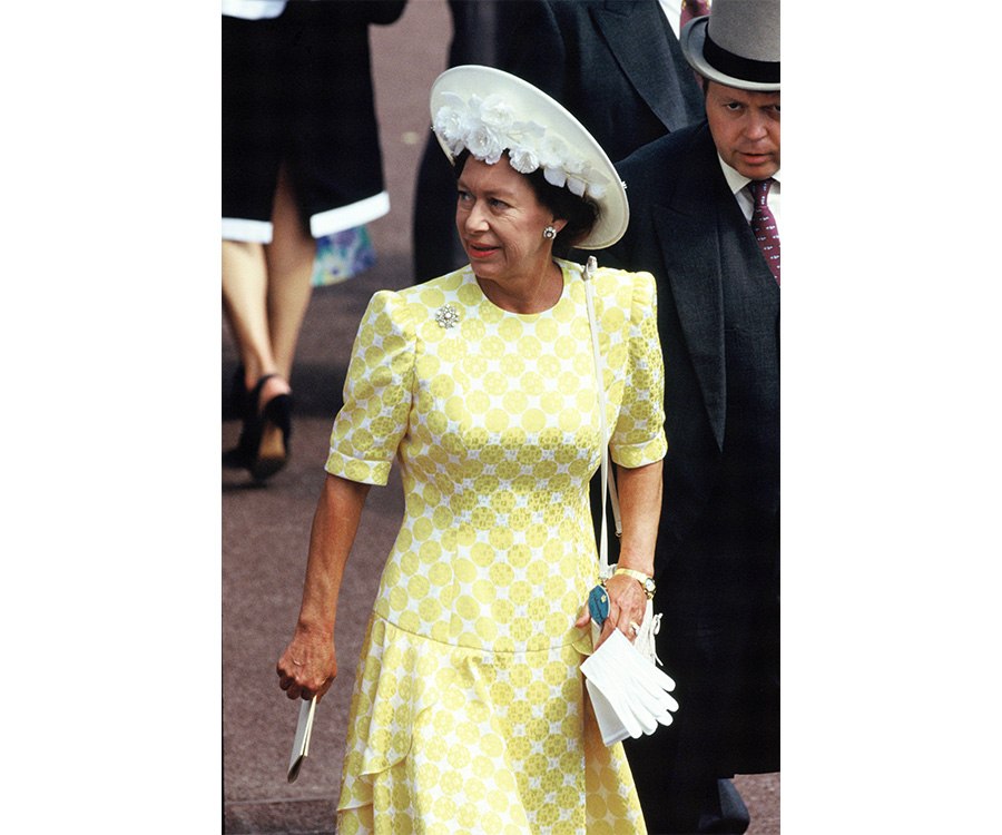 △ 1989年6月21日,瑪格麗特公主身穿白黃相間的連衣裙,出席皇家阿斯科特(Royal Ascot)賽馬會。