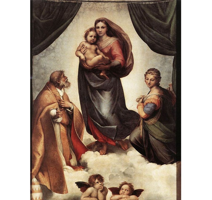《西斯廷聖母》(Sistine Madonna或Sadine Madonna di San Sisto):1512年,受到教皇朱利葉斯二世(Pope Julius II)委託建造皮亞琴察聖西斯托教堂(the church of San Sisto, Piacenza)。這是拉斐爾晚年繪製的一幅聖母像。