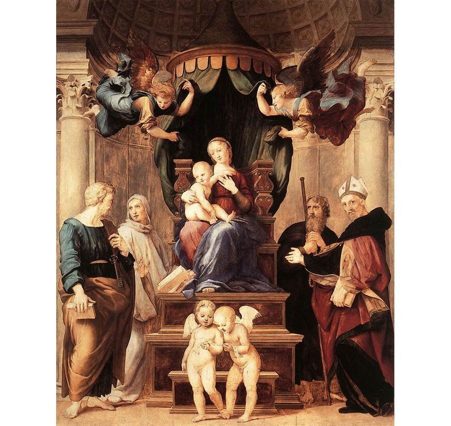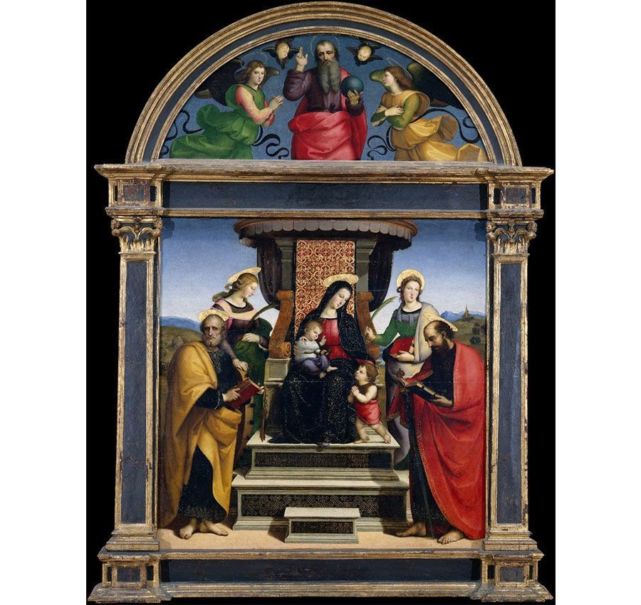 《聖母子被聖者推崇登基》(Madonna and Child Enthroned with Saints):拉斐爾在1504年左右,為意大利佩魯賈(Perugia)的聖安東尼奧方濟各會修道院(the Franciscan convent of Sant’ Antonio)所繪。