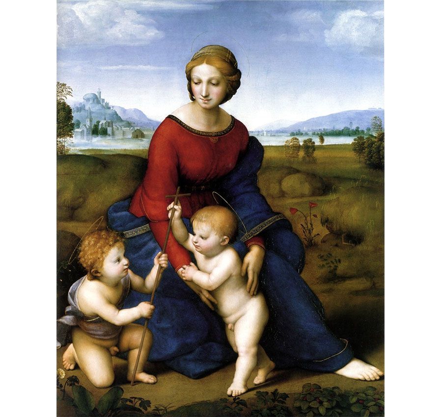 《草原的麥當娜》(Madonna of the Meadow):拉斐爾於1505-1506年創作這幅畫,它有好幾個名字,包括《麥當娜的草地》(Madonna del Prato)。或《麥當娜與基督的孩子和施洗者聖約翰》(Madonna with the Christ Child and Saint John the Baptist)。由於它曾經是維也納麗城(the Vienna Belvedere)皇家收藏的一部分,所以長期以來被稱為《麥當娜·德爾麗城》(Madonna del Belvedere)。